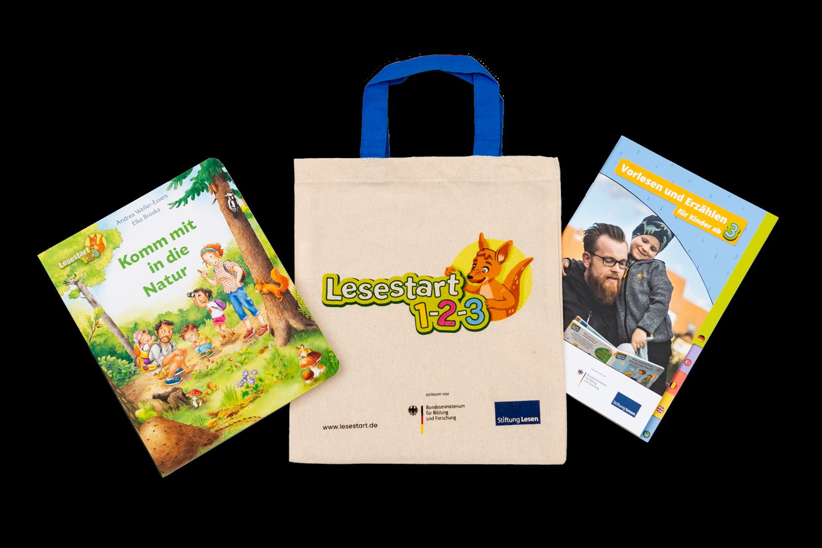 Lesestart 1-2-3 besteht aus drei Geschenk-Sets für Eltern mit Kindern im Alter von einem, zwei und drei Jahren. Die ersten beiden Sets können Sie in teilnehmenden Kinderarztpraxen bekommen, das dritte Set in der Bücherei vor Ort. Zu allen drei Sets gehören ein altersgerechtes Bilderbuch, Informationen für die Eltern mit Alltagstipps zum Vorlesen und Erzählen und eine kleine Stofftasche. (Mehr Infos: www.lesestart.de)